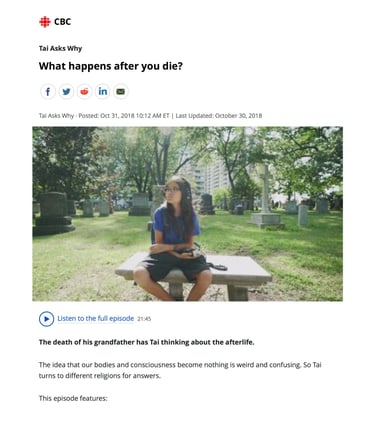 CBC interviews Zenji Nio as a major voice for Asians and Buddhists - and his views on the Buddhist approach to dealing with death and bereavement. Zenji Nio is often called to comfort people in their hours of need as he promotes a blend of both compassion with courage, of empathy with empowerment.