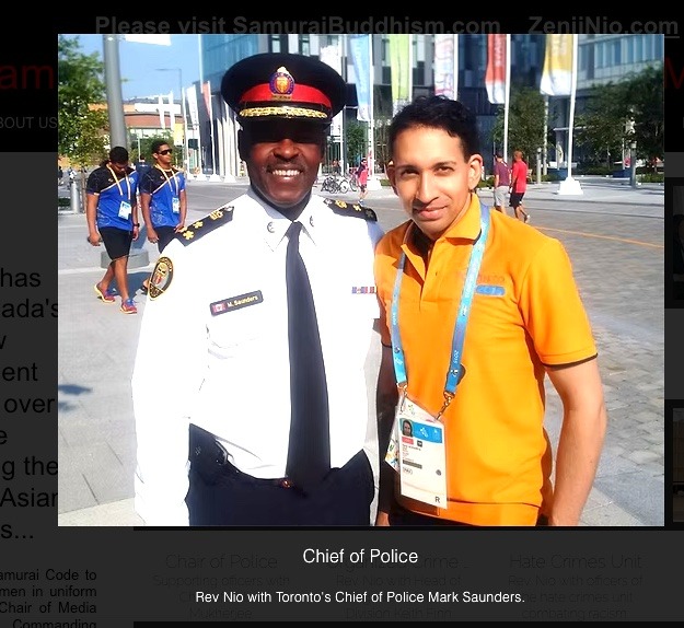 Zenji Nio made history by launching a Samurai Buddhist Museum inside the Athlete's Village and was given the highest security clearances to do so. Here Zenji Nio and Police Chief Mark Saunders discuss security arrangements for museum treasures on display inside the Athlete's Village.